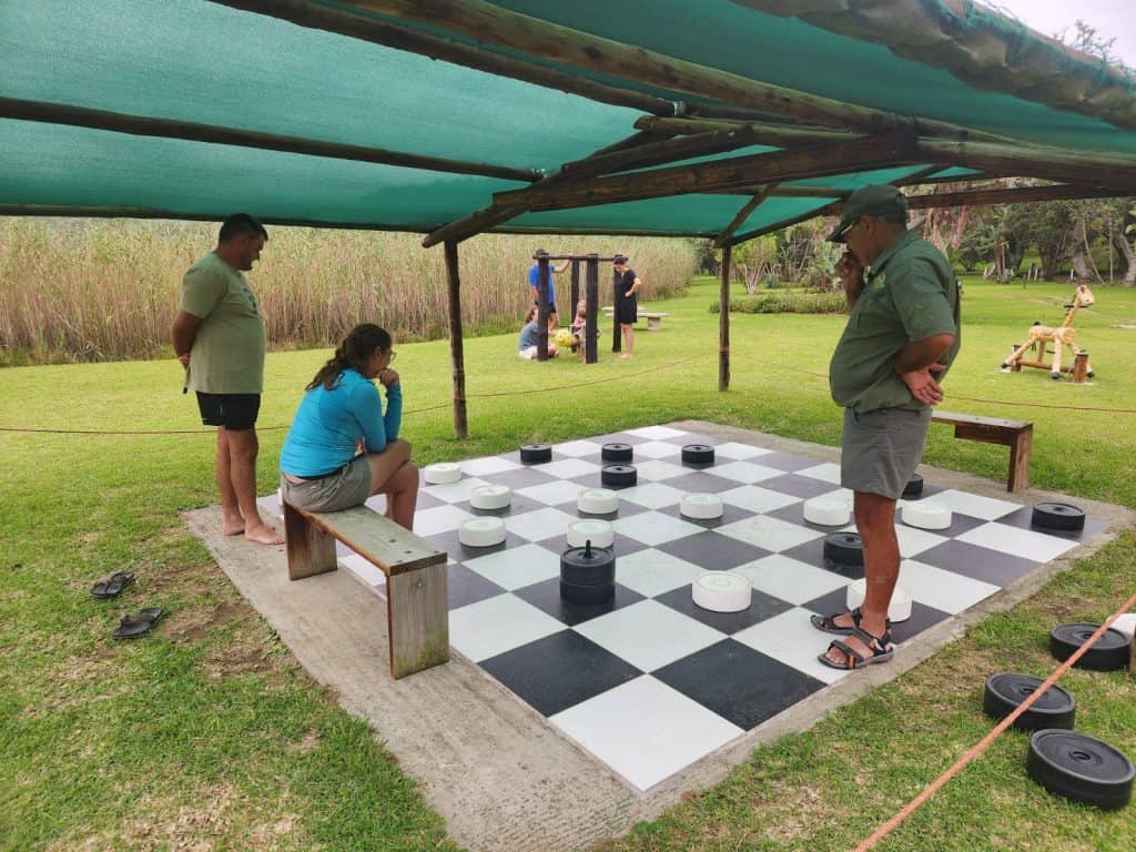 Die speelparkie het ‘n groot buitelug-skaakstel en dambord.